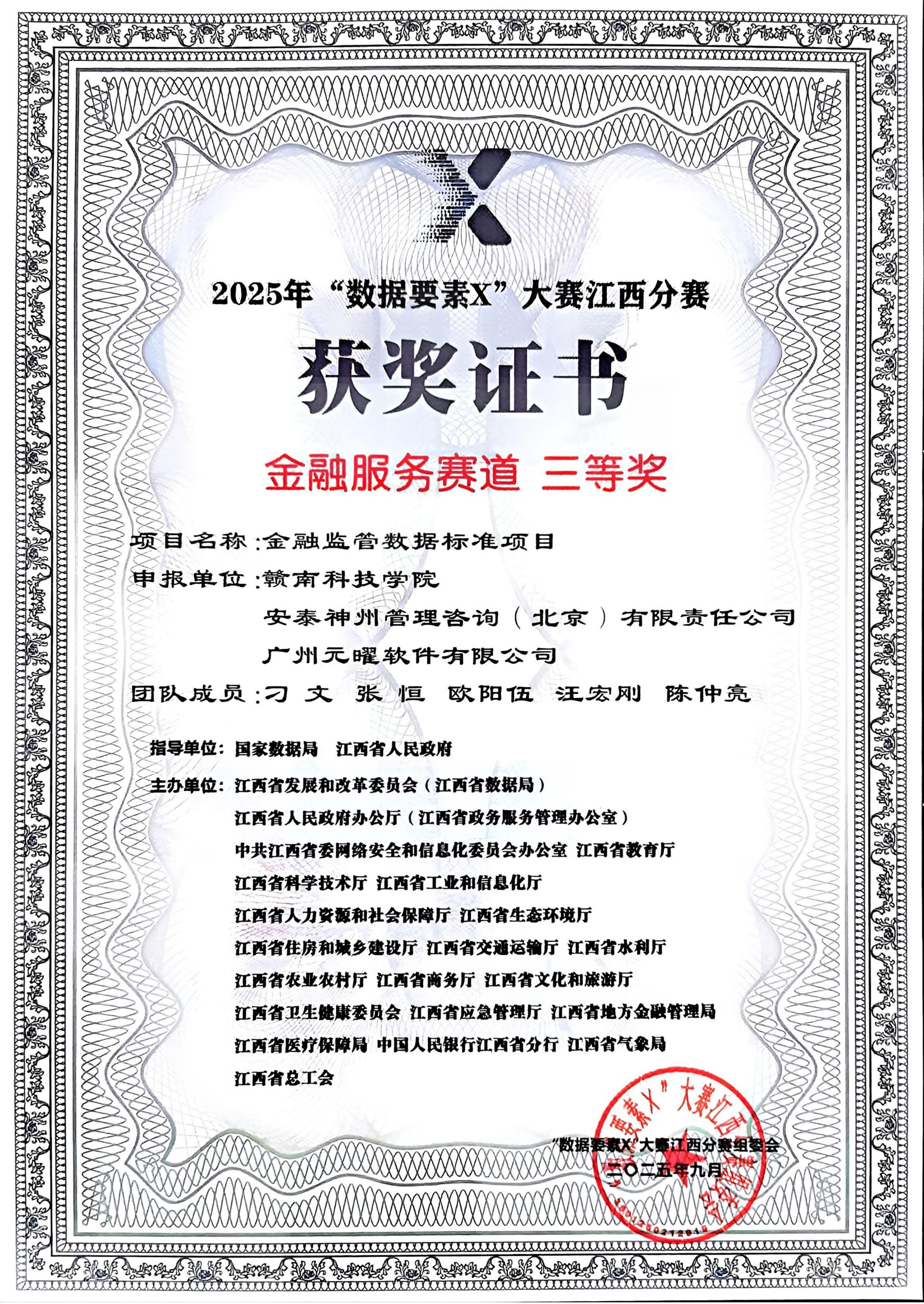 本网讯:近日,由国家数据局、江西省人民政府指导,江西省发展改革委(省数据局)联合20家省直部门共同主办的2025年“数据要素×”大赛江西分赛决赛获奖名单发布,我校信息工程学院专任教师刁文、张恒、欧阳伍团队凭借“金融监管数据标准项目”在金融服务赛道中脱颖而出,荣获三等奖,位列全省第10。这是我校首次在此项国家级赛事中获奖,实现了历史性突破。该项目充分发挥数据要素在金融行业的乘数效应,构建了能跨越不同监管、具备高可操作性的金融监管数据标准体系,有效提高了金融服务领域的数据分析能力。