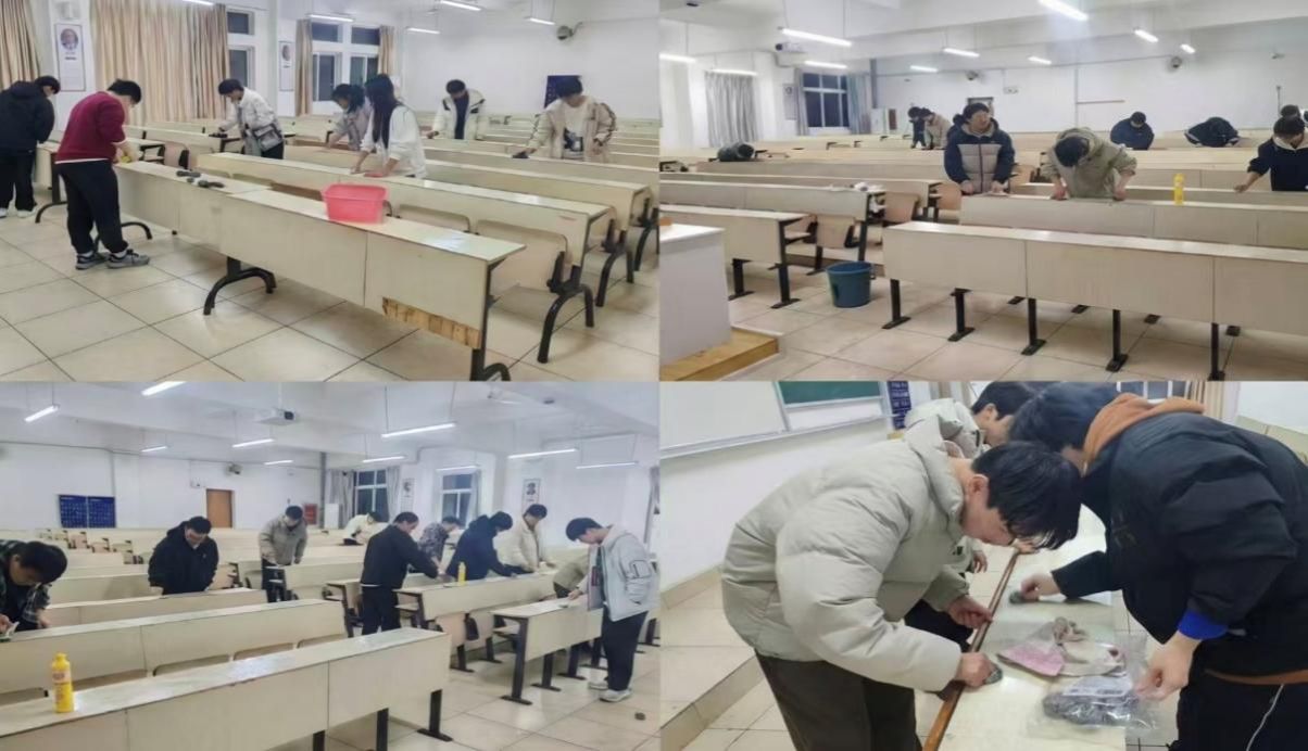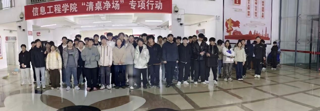 本网讯:为积极响应教务处严肃考风考纪的号召,全力为即将到来的期末封闭考试打造一个纯净、公正的应试环境,1月8日,信息工程学院精心组织开展了“清桌净场”专项行动。176名学生志愿者对崇善楼C区、D区三楼及四楼的所有考场进行了全面清理。