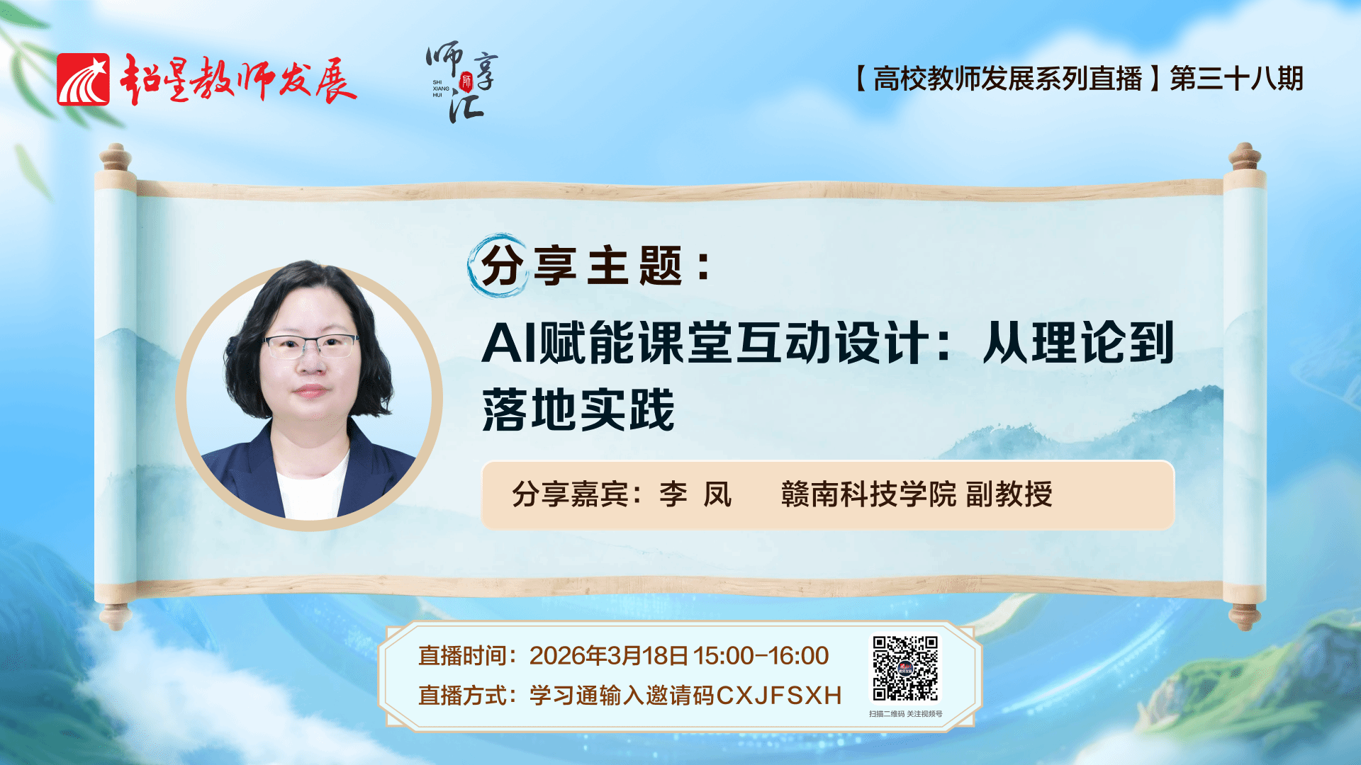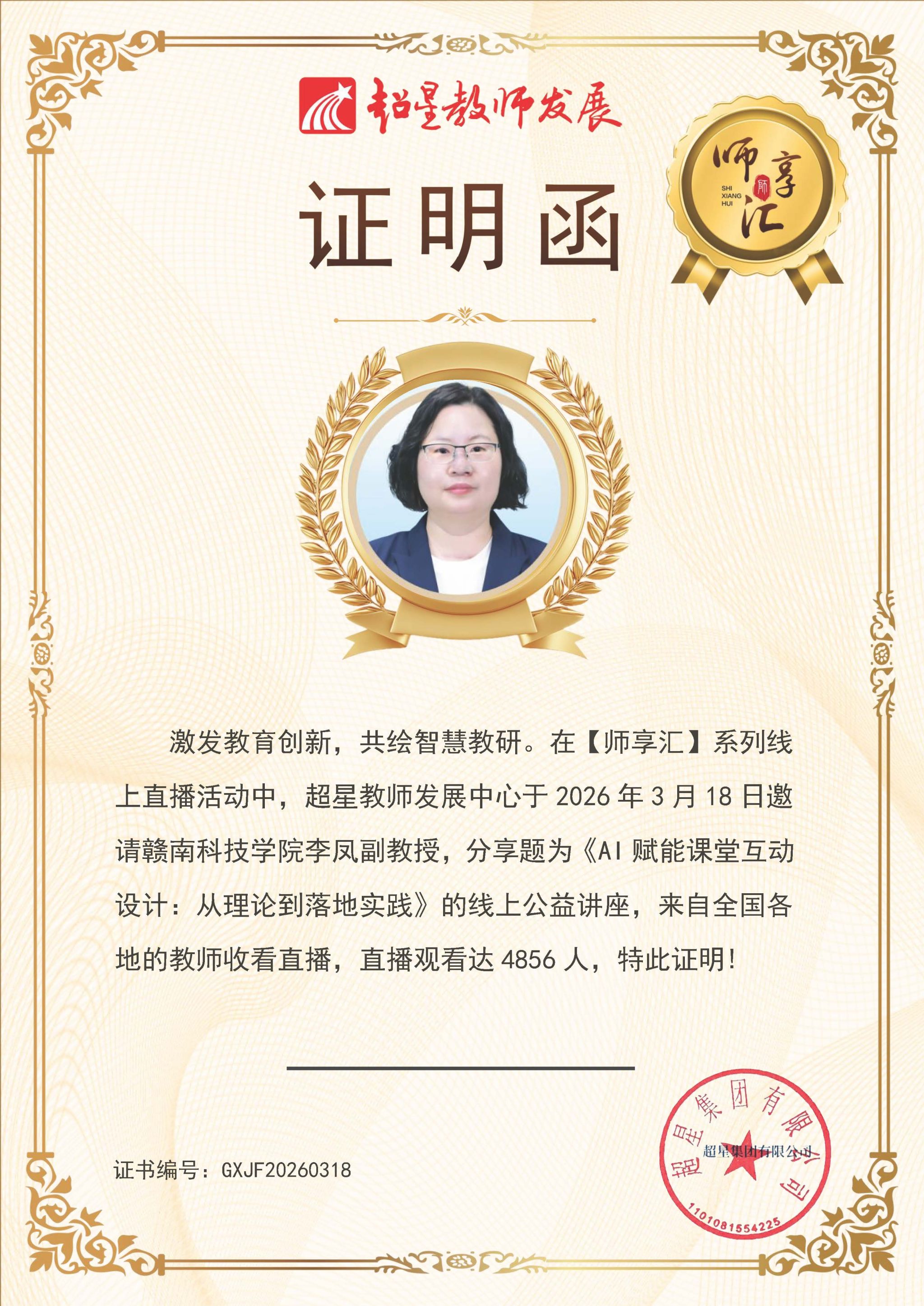 本网讯: 3月18日下午,由超星教师发展中心主办的“师享汇”系列线上公益讲座如期开播。我校信息工程学院李凤副教授受邀作题为《AI 赋能课堂互动设计:从理论到落地实践》的专题直播分享。本次讲座吸引了来自全国近5000名高校教师云端观摩,为广大高校教师带来了一场理论与实践并重的学术盛宴,充分展示了我校教师在教育数字化转型背景下的前瞻性探索与教学风采,极大提升了赣南科技学院在全国高校教研领域的知名度与影响力。