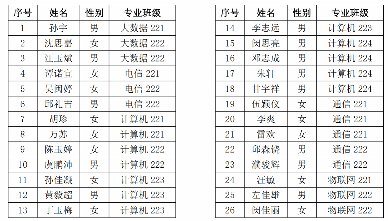 根据《赣南科技学院先进集体、先进个人评选办法》(赣科院学字〔2025〕27号)文件有关要求,信息工程学院认真组织开展2026届优秀毕业生初评,经学生个人申请、班级评议、学院优秀毕业生评审小组集体评审,确定信息工程学院2026届优秀毕业生初评名单,现予以公示。