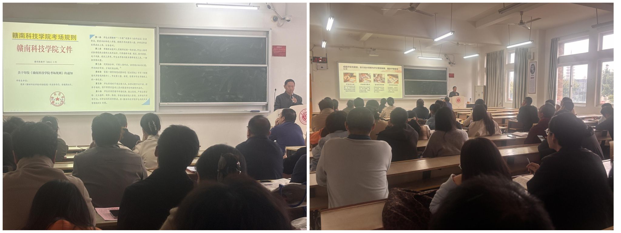 会上,张学林带领全体教职工深入学习了《赣南科技学院课程考核与成绩管理办法》《赣南科技学院监考守则》及《赣南科技学院考场规则》三份核心文件。他重点解读了“过程性评价与终结性评价相结合”的双轨考核模式,并围绕考核方式、命题规范、试卷管理等关键环节进行了系统阐述。同时,会议对监考人员的职责与流程、考场纪律的执行要点,包括证件查验、物品管理、违纪处理等,均作出了明确要求与部署。
