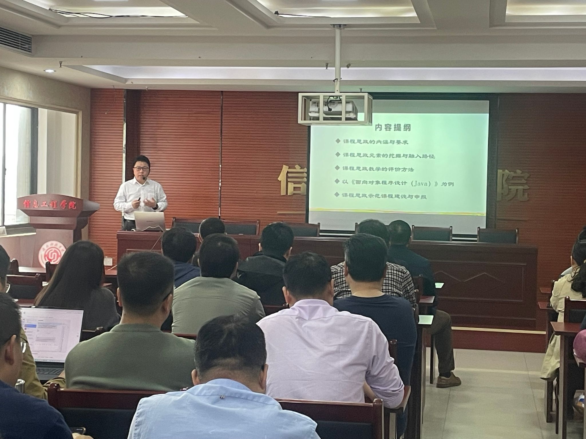 本网讯:为全面深化课程思政建设,切实贯彻立德树人的教育理念,4月7日下午,信息工程学院特邀东华理工大学计算机系主任、国家级教学创新团队核心成员张军教授,作题为《课程思政元素挖掘与融入路径》的专题报告。学院全体教师参加此次学习交流活动,信息工程学院党委副书记邓小鸿主持会议并作总结讲话。