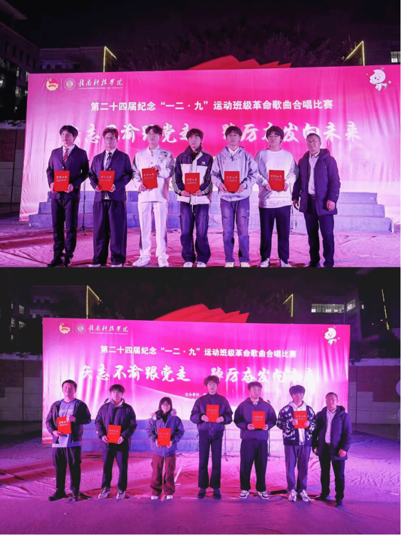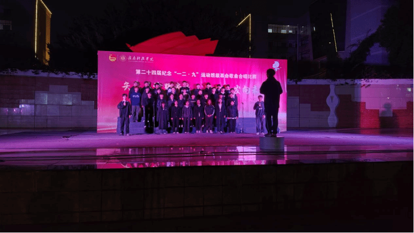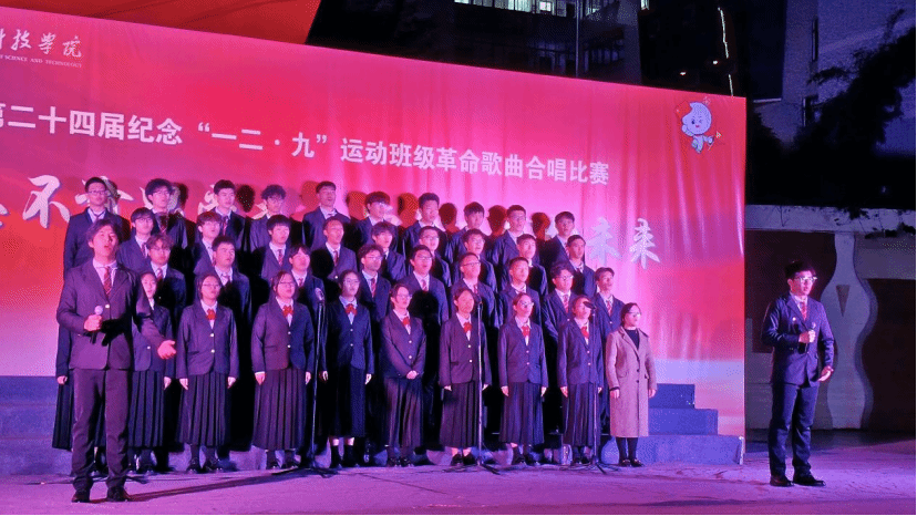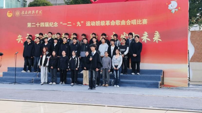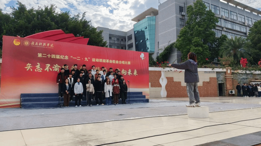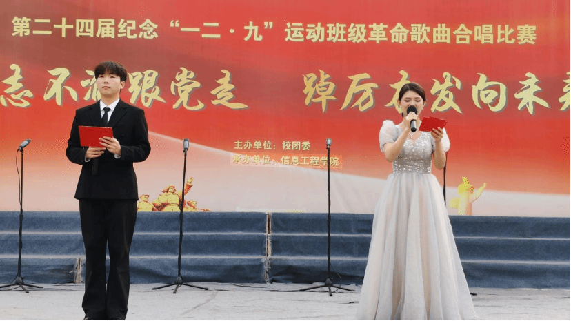 本网讯:为纪念“一二·九”运动90周年,传承爱国精神,凝聚青春力量,11月23日,信息工程学院第二十四届“一二·九”革命歌曲大合唱比赛在学校冶金广场隆重举行。全院25个老生班级、13个新生班级齐聚一堂,用嘹亮歌声重温峥嵘岁月,以青春旋律抒发报国情怀。