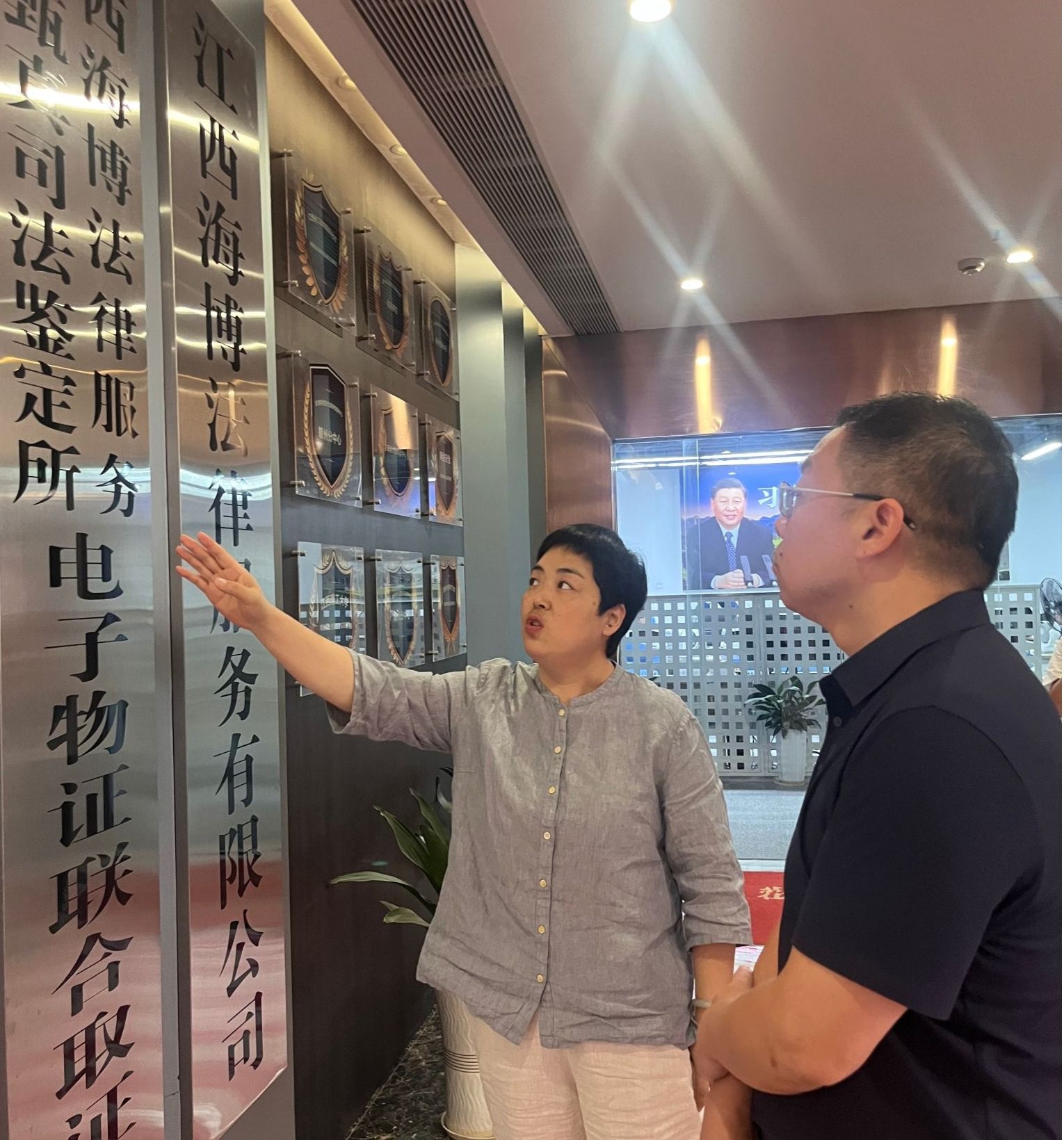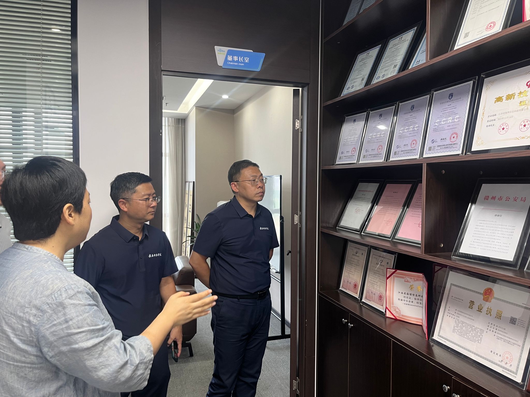 在公司相关负责人的陪同下,邓小鸿一行参观了海博信息科技有限公司的办公环境及业务展示区,详细了解了企业的发展历程、主营业务、技术成果及人才需求情况。参观过程中,双方就信息工程专业学生的培养方向、实习实践平台建设及就业渠道拓展等方面进行了深入交流。